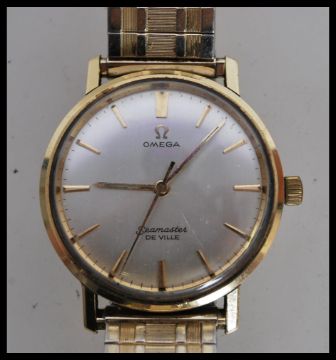 A 20th century Omega Seamaster Deville waterproof watch with a 10ct gold case, a metallic steel watch face with stick markings, a seahorse emblem to the verso and a yellow gold expandable watch bracelet.