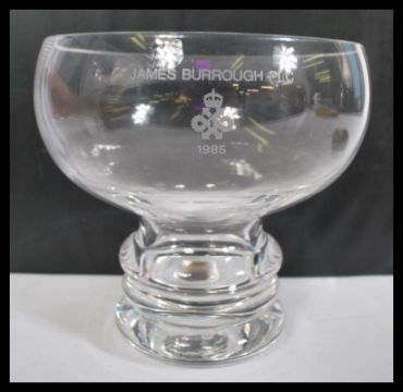A James Burrough specially struck Royal Mint silver proof coin in case with capsule along with a matching glass goblet etched James Burrough PLC 1985. measures: 13cm high x 13cm diameter.