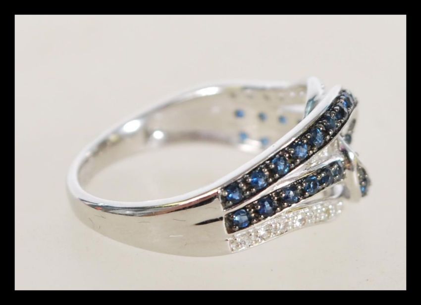 A 14ct white gold cross over split shank ring with channel set blue stones and white stones size N.5.