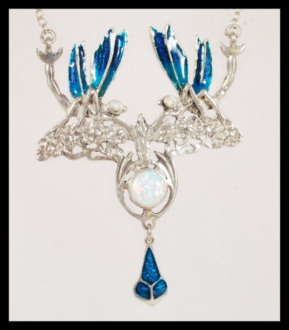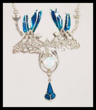 A 20th century Art Nouveau style silver and enamel pendant necklace with a central opal and dragon flys.