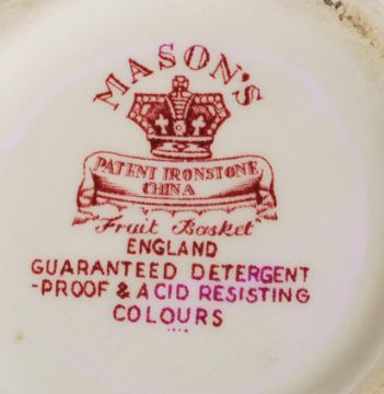 A group of 20th century vases to include a Wedgwood cobalt blue stem vase with white leaves to the rim and matching plate (unsigned), Masons's Fruit Bowl pattern vase, a Chatsworth Late Mayers vase with blue and white floral sprays and gilt work to the rim, a Bewley pottery vase of autumnal colouring, a matte glazed floral jug stamped Burlington, a narrow necked stem vase depicting a bird. Please see images for full details. measures: 26 cm high x 12 cm wide.