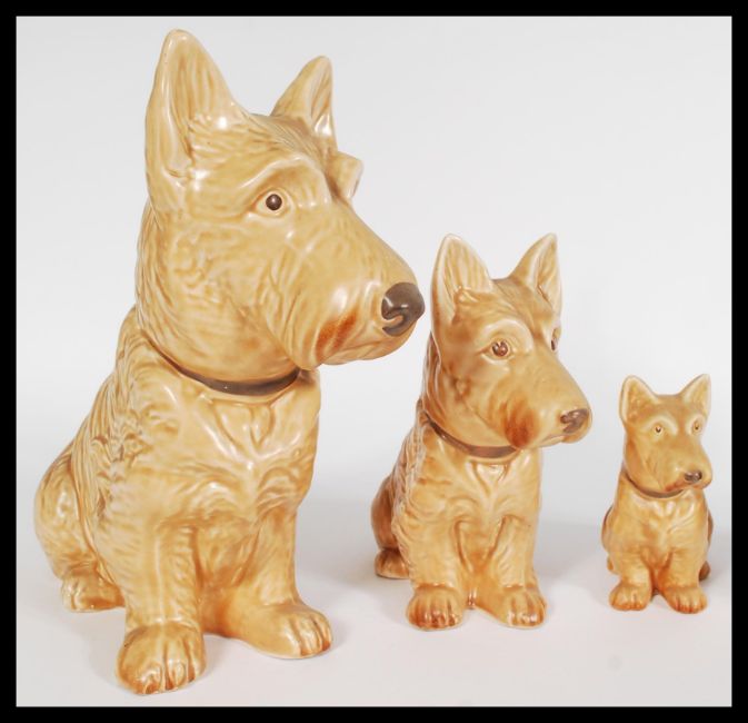 A collection of vintage 20th century SylvaC ceramic graduating dog figurines of brown terriers with matte glaze, numbers stamped to the base including 1209, 1207, 1206, 1205, 148 and 139. measures: 28cm high x 11cm wide x 31cm diameter.