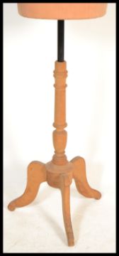 An early 20th century vintage tailors shop front ladies half dummy mannequin on a wooden a three legged triple base, the body being covered in peach satin. Measures 175 cm high.