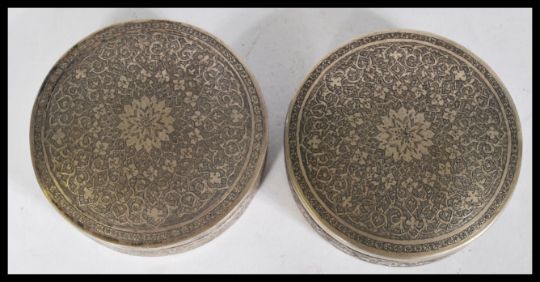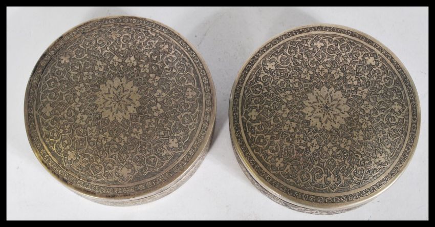 A pair of Persian Iranian silver white metal trinket boxes of circular form with Islamic geometric embossing around a central medallion and floral patterning to the outer rim. The boxes are stamped 84 to the bases weighing 309g. Measures: 10cm diameter.