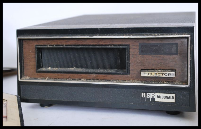 A vintage retro 20th century 8 track player along with a collection of 8 track cassettes.
