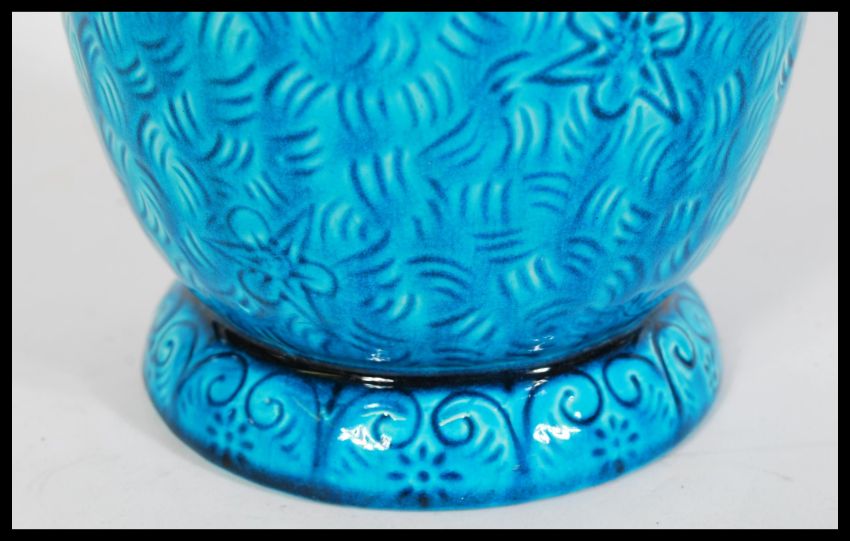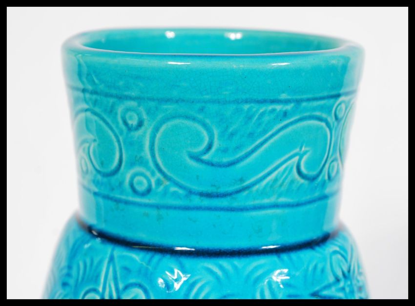 A late 19th century turquoise Burmantofts faience art pottery vase having engraved floral patterning stamped to the base. measures: 40 cm high x 13 cm diameter.