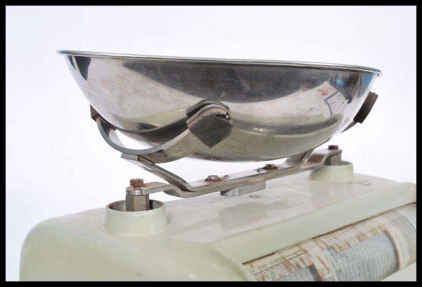 A set of vintage retro 20th century Industrial Avery weighing grocers scales having a lime enamel finish with chrome weighing pan.