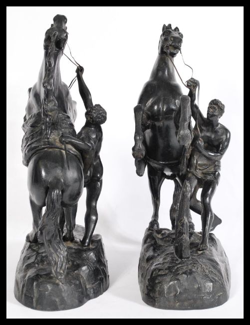 A pair of vintage 20th century spelter figurines of Marley horses and tamers raised on naturalistic bases.