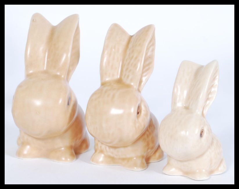 A collection of vintage 20th century ceramic SylvaC graduating brown bunny rabbit figurines to include numbers 1028, 990. measures: 25cm high x 13cm wide x 19cm diameter.