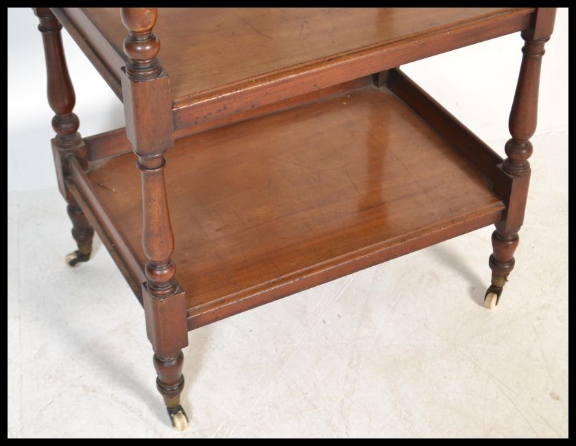 A 19th century Victorian mahogany four tier buffet ( whatnot / etargere )  supported on vase shaped turned columns and supported on ceramic castors. Measures: 120cm high x 61cm wide x 42cm diameter.
