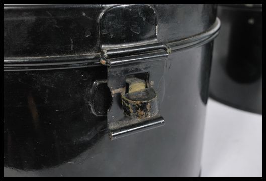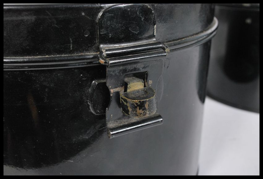 A pair of early 20th Century ebonised metal hinged hat boxes  ( Box ) of circular form. Measures: 17cm high x 28cm diameter.