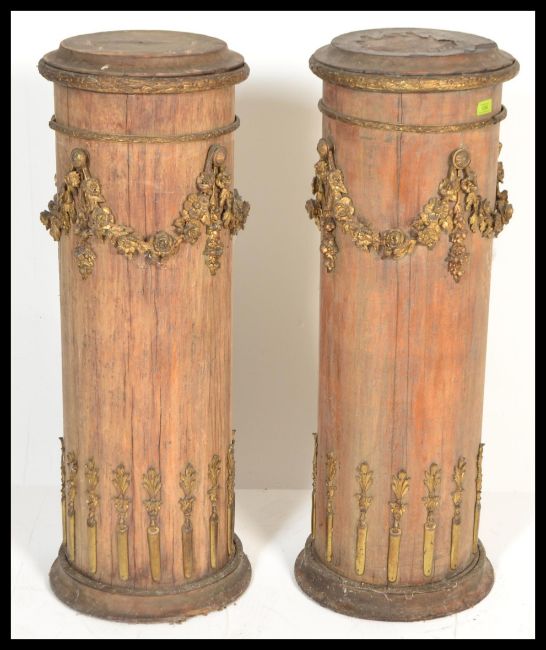 A pair of late 19th Century pedestal column plant / bust stands. Each pedestal heavily decorated with applied gilt metal ormolu detailing and raised on a circular base. Measures 100 cm x 35 cm.