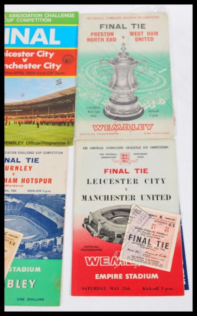 A complete collection of The Football Association Challenge Cup Final programmes from the 1960's, dating from 1960 through to 1969, many with original tickets to include Blackburn v wolves 1960 ( ticket ), Leicester v Tottenham 1961, Burnley v Tottenham 1962 ( ticket ), Leicester v Man United 1963 ( ticket and song sheet ), Preston v West Ham 1964, Leeds v Liverpool 1965, Evetrton v Sheffield Wednesday 1966, Chelsea v Spurs 1967 ( ticket ), Everton v West Brom 1968 ( ticket ) and Leicester v Man City 1969. measures: 24.5cm high x 17cm wide biggest.
