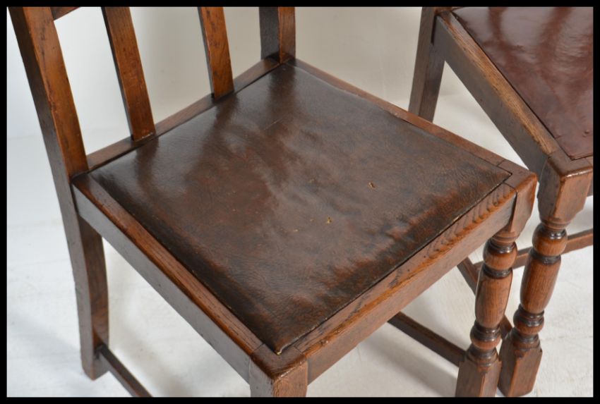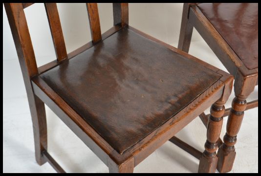 A set of four 20th Century Art Deco style dining chairs, drop in seats with a portcullis cross frame back raised on turned supports united by stretchers.