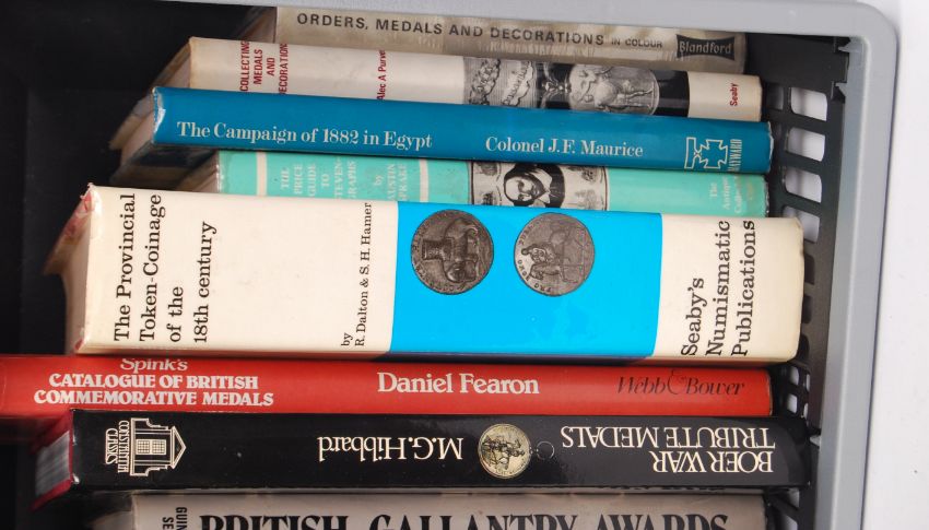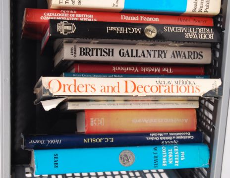 A very good collection of assorted Military Medal / Coins and related guides / catalogues / books. Various titles, to include; Boer War Tribute Medals, The Medals Yearbook, British Gallantry Awards, Token Coinage Of The 18th Century, Price Guide Of Steven-Graphs, Orders And Decoration and other. Very good reference books.