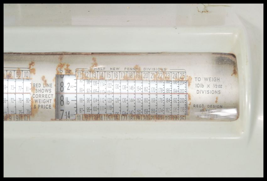 A set of vintage retro 20th century Industrial Avery weighing grocers scales having a lime enamel finish with chrome weighing pan.