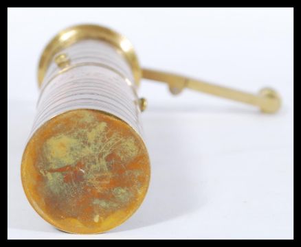 A set of 19th century brass serving spoons including a ladle, salad spoon and slotted spoon, a three pronged toasting fork and a Turkish coffee grinder with engraved detailing. measures: 29.5cm high for grinder.