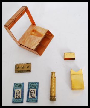 A very rare Gillette gold / gilt razor 1917 edition no. 133963 in metamorphic faux mother of pearl Lucite case with razor blade box.