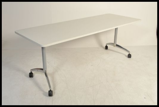 A Senator S21 Flight table, conference table with aluminium finish legs on plastic casters that folds upright for storage. The table ideal as a modernist dining table