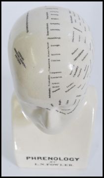 A vintage 20th century ceramic Phrenology Head / crackle glaze cream ceramic bust, marked ' Phrenology By L. N. Fowler. Measures 26cm-high 13cm-wide.