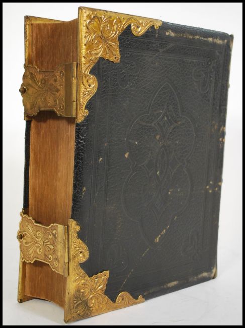 A 19th century leather and brass bound bible having tooled notation - National Comprehensive family bible by Rev John Eadie. Measures 33cm-high 27cm-wide.