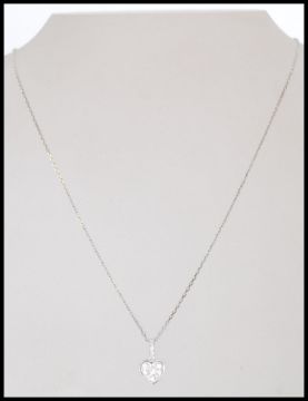 A hallmarked 18k white gold and diamond pendant necklace strung with a heart shaped pendant with pierced back set with diamonds, with accent diamonds to bale. Diamonds approx 20pts. Hallmarked London to chain. Pendant hallmarked Sheffiled.  Weight 2.1g.  Measures 16 inches.