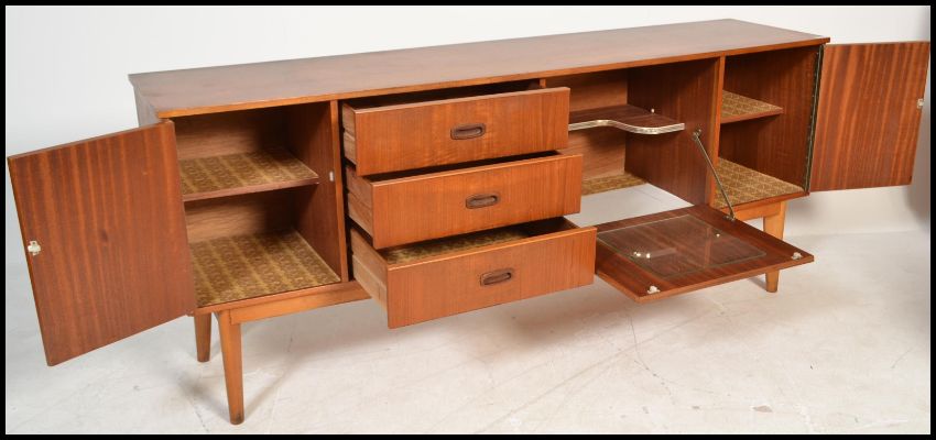A vintage retro 20th century teak wood sideboard raised on tapered supports with bank of drawers, twin cupboard and drop front cocktail cabinet cupboard. Measures 75 cm x 180 cm x 43 cm.