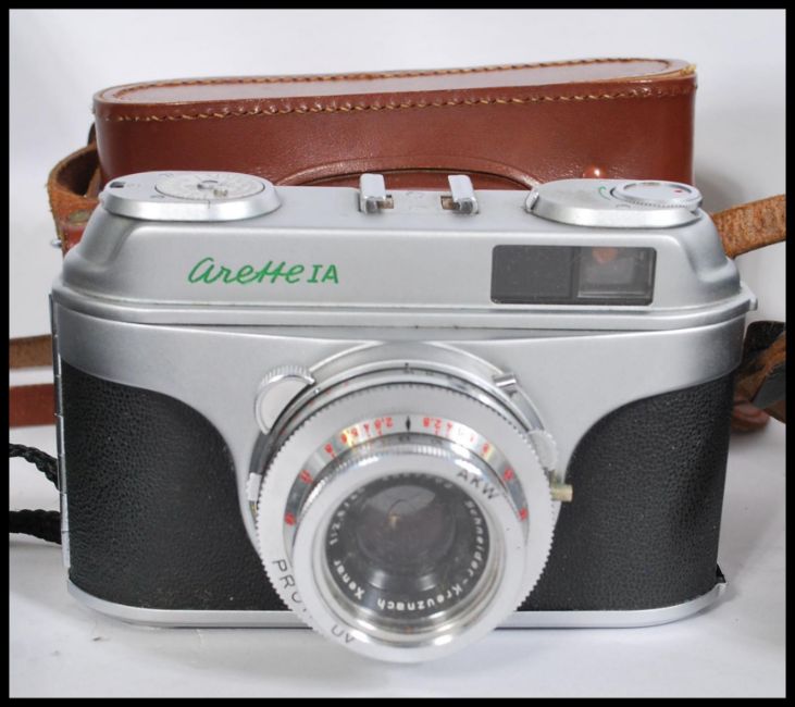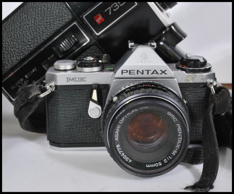 A collection of vintage 35mm cameras and lenses, to include an Olympus OM 10, Minolta x - 300, Arette IA, Practica LB with Carl Zeiss lens, Pentax ME etc. Biggest measures 19cm-high 24cm-wide.