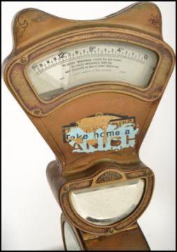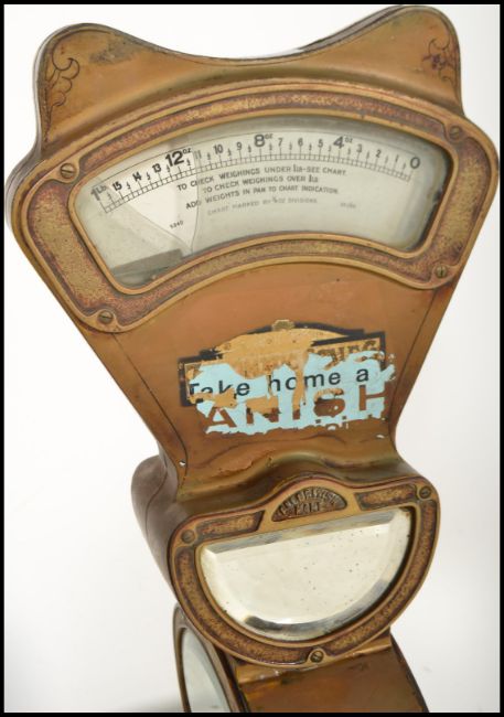 A large set of early to mid century Industrial shop enamel gilt metal and mirror glass grocers scales with central fan dial mirrors with makers label for the Automatic Scale Co Ltd ( model style no 451 ). Measures 80 cm x 67 cm x 26 cm.