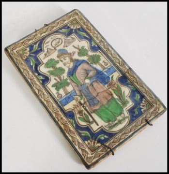 Withdrawn Withdrawn. A 19th century Persian large stoneware tile featuring a portrait of a man with a sword with a floral border, with hand painted cobalt blue and green detailing. Measures 26 cm high and 17 cm wide.