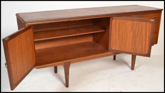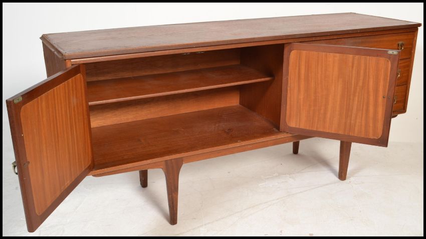 A 1970's teak wood ' waffle ' sideboard credenza being raised on tapering legs with a 'waffle' style set of cupboard doors flanked by a bank of drawers. As per first picture measures75cm high x 155cm wide x 47cm deep.
