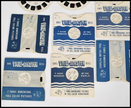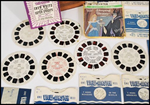 A vintage black bakelite Sawyers View Master with slides including 'Snow White and the seven Dwarfs', 'Tarzan Finds a Son', 'Robin Hood meet Friar Tuck', 'Batman', 'Cinderella', and Walt Disney presents Sleeping Beauty'.  Box measures 17cm-high 12cm-wide.