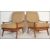 A pair of retro 20th Century open framed teak wood lounge / fireside armchairs each being upholstered with a chintz button back velour fabric and raised on shaped legs. Measures: 88cm high x 60cm wide x 66cm deep.