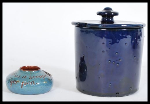 A selection of C. H. Brannam north Devon wares to include a small ink pot with a floral design reading 'send us a scrape o' yer pen', a squat ochre jug inscribed 'may all thy hours be winged with joy', a puzzle jug inscribed with poetry, a green glazed vase with four handles to the top and a blue lidded jar with ceramic finial, stamped C.H. BRANNAM to the base with the other pieces all hand signed to the bases. Tallest measures 23cm-high 15cm-diameter.