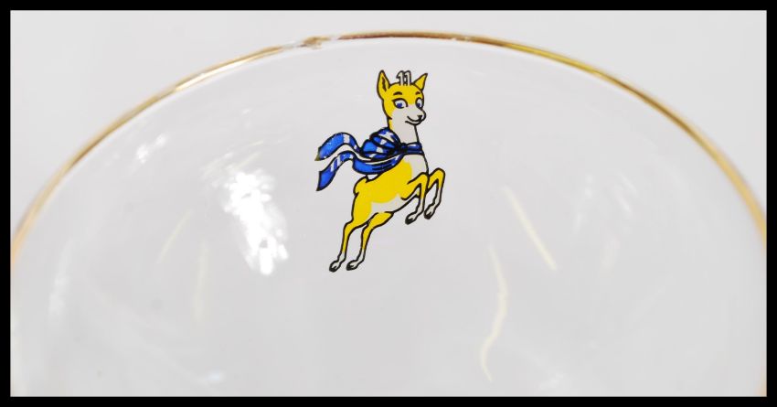A collection of fourteen vintage 20th Century advertising point of sale glasses for Babycham, to include 1950's white fawns and 1960's yellow fawns. Measures 11cm-high 9cm-diameter.