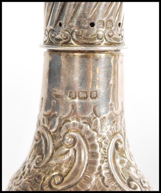 A 19th century hallmarked silver cruet / pepper pot, raised on a round base with embossed floral decoration, marked J Round & Sons circa 1893. Measures 11 cm high.