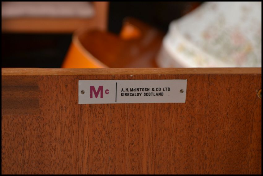 A 1970's  Danish inspired McIntosh sideboard / credenza being raised with tapering legs comprising cupboards and drawers to the wide body. Measures: 76cm high x 214cm wide x 46cm deep.