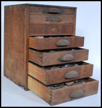 A selection of 20th century watch glasses of various sizes in a wooden case having graduating drawers with interior dividers containing a large quantity of organised watch glasses.