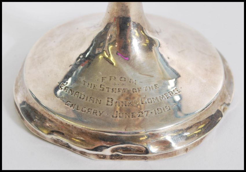 An early 20th century sterling silver tall vase raised on a circular base with trumpet column and flared rim. Engraved floral sprays present to the body with engraving to the base reading From The Staff Of The Canadian Bank of Commerce Calgary June 27 1919. Stamped sterling. Measures 35cm-high 11cm-diameter.