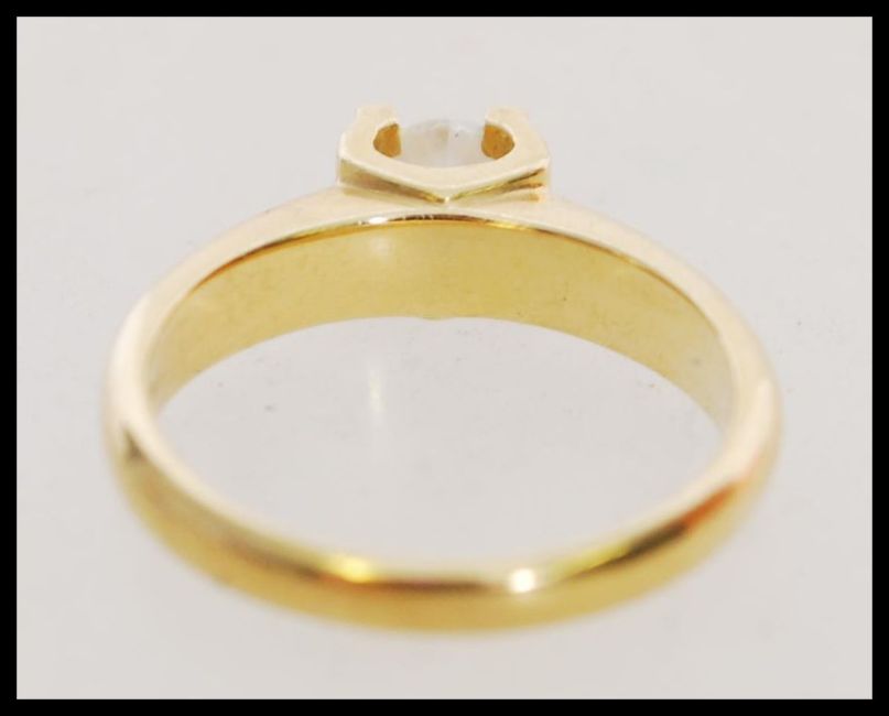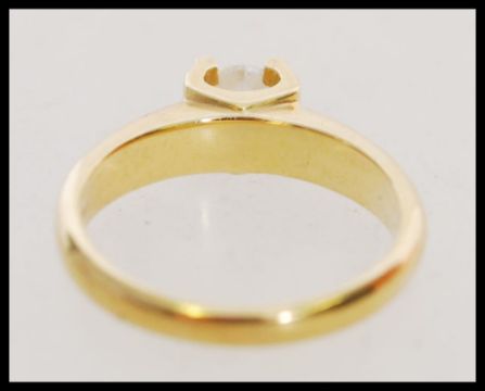 A stamped 750 18ct yellow gold and diamond solitaire ring having a single prong set round brilliant cut diamond. Diamond approx 40pts. Marked 750 tests 18ct gold. Weight approx 5g. Size M.