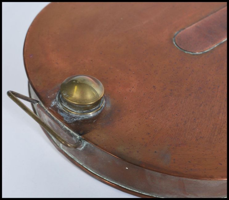 A 19th century copper charger / decorative plate with Persian Islamic pattern engraving to the plate, along with a copper foot / bed warmer of oval form with a brass handle. Charger measures 38 cm diameter.