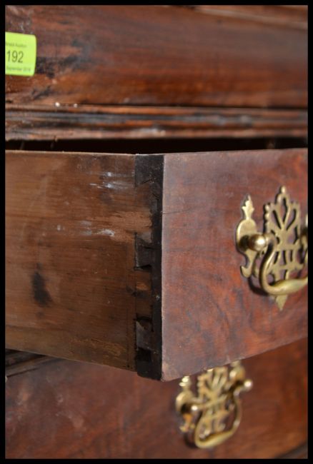 A George III oak chest on chest of drawers on stand, the moulded cornice above two short and three long graduated drawers with iron locks and gilt pierced brasses on a  base of 4 drawers above a shaped apron and on cabriole legs. Measures: 168cm high x 110cm wide x 65cm deep