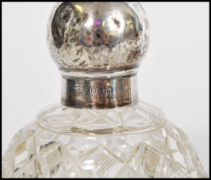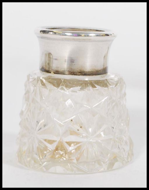A collection of silver hallmarked and cut glass ladies vanity wares. To include perfume bottles, perfume phial, rouge pot and a rococo silver pot pourri pot., Hallmarks for Birmingham, London etc ( 5 items total ) Tallest measures 10cm-high.