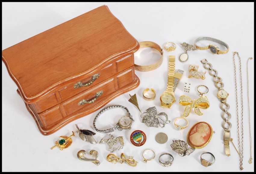 A collection of costume jewellery to include rings, watches, silver rings, brooches, two 9ct gold hallmarked necklaces etc, all within a wooden jewellery box. Jewellery box  Measures 10cm-high 19cm-wide.