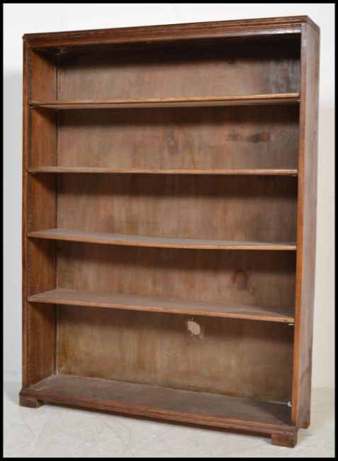 A mid century solid oak open window bookcase cabinet being raised on a plinth base with a series of adjustable shelves set to centre. Measures 136 cm x 102 cm x 24 cm.