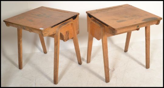 A pair of mid 20th Century school / students desks, lift up top with storage below raised on bent wood supports, stamped to the underside with military crows foot and A / C. Measures: 65cm high x 60cm wide x 58cm deep.