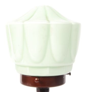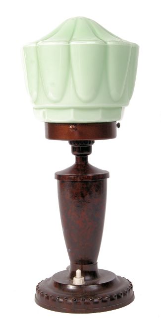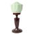 An Art Deco early 20th century Bakelite table lamp having a stepped base with urn pedestal and waisted neck stamped WG to base. The lamp shade being a Thabur mint green tented milk shade.  Measures 32 cm high.