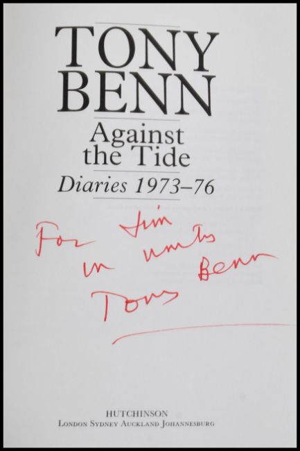 A signed edition of Against the Tide Diaries 1973-76 by Tony Benn published by Hutchinson 1989 concerning 1970's politics, hard backed with a dust sleeve. Measures 24cm-high 16cm-wide.