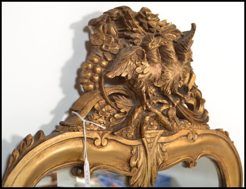 A 20th century Regency revival French wooden framed carved gilt wall mirror having a shaped frame with carved detailing and twin eagle design to the top. Measures 66 cm x 45 cm.