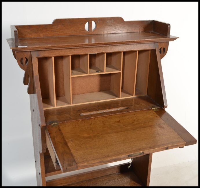 A late 19th century oak arts & crafts student bureau in the manner of Liberty & Co. The fall front bureau with gallery top and bookcase to the lower base.
